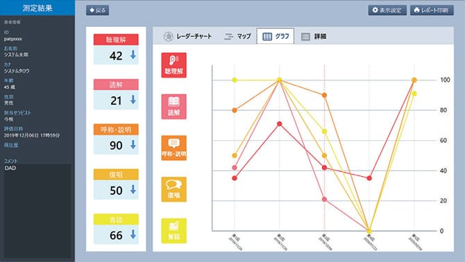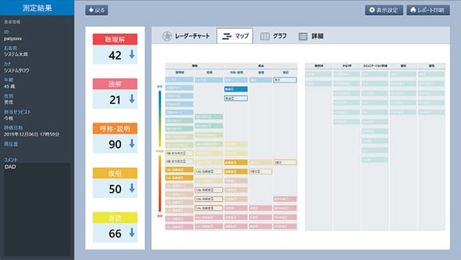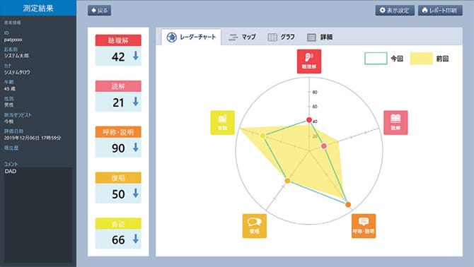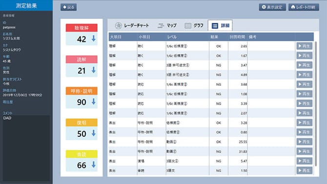 スクリーニングの結果を元に、言語機能の各要素(聴理解・読解・呼称説明・復唱・音読)を詳細に評価し、スコアを掲示する評価機能です。