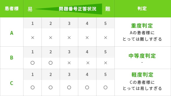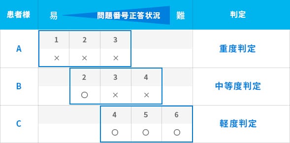 - Aあらかじめ患者様のスクリーニング結果によりレベルに応じた課題を出題することにより、患者様への負担の軽減と大幅な時間短縮が見込まれます。